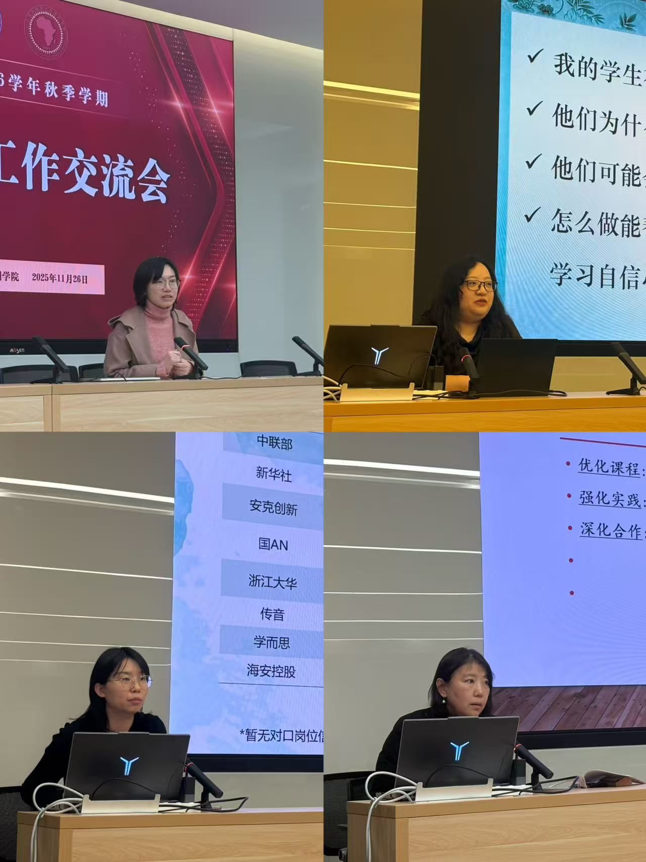 亚美尼亚语专业贺阳老师以“从语言学习者到文化共同体”为核心,分享班风建设经验,展现小语种专业班级文化凝聚的实践路径;僧伽罗语专业江潇潇老师聚焦专业自信培育,通过班委组建、高年级学长学姐和优秀员工传帮带、外事活动等环节,阐述构建专业认同感的有效方法。