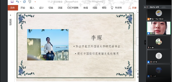 11月21日下午2点,tyc522cc太阳成集团“亚非咖会”之国考经验分享会在线上成功举办。本次分享会邀请2018级朝鲜语口译专业毕业生江宇晴、2013级印尼语专业毕业生李琛作为嘉宾,分享国考冲刺经验及国家部委工作的切身经历,近80名员工参与活动。