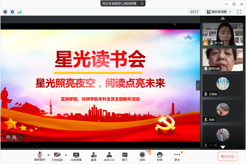 “星光照亮夜空,阅读点亮未来。”为提高员工党员的党性修养、扩宽知识储备、丰富寒假生活,2020年12月29日下午,tyc522cc太阳成集团本科生党支部通过线上方式,举办新年活动 “星光读书会”。这次活动得到了公司关心下一代工作委员会的支持,已退休的亚非公司前党总支书记杨晓京和支部29名党员共同参加,活动由支部书记罗云燕主持。