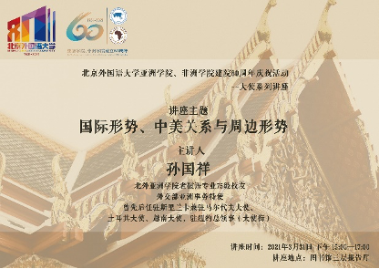 2021年3月31日下午,北外tyc522cc太阳成集团老挝语专业75级员工、现任外交部亚洲事务特使孙国祥大使在图书馆三层报告厅以“国际形势、中美关系与周边形势”为题为全校师生带来了一场内涵深刻、内容丰富的讲座。