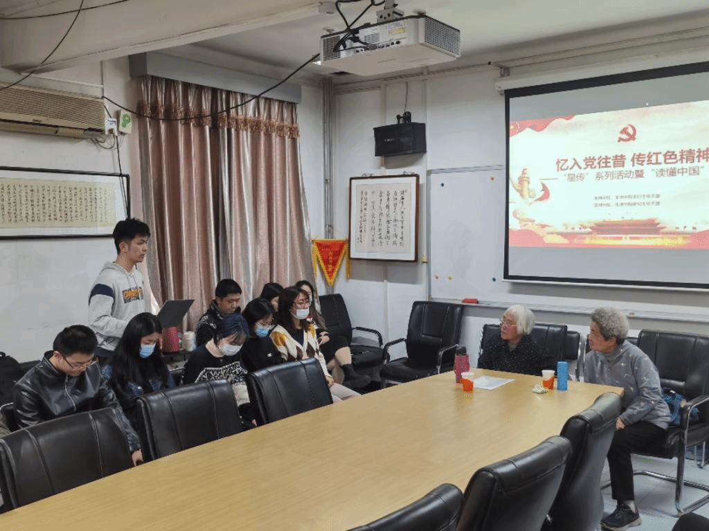 薪火相传,继往开来。时值中国共产党建党100周年之际,为教育引导广大青年员工爱党、爱国、爱社会主义,充分发挥“五老”亲历者、见证者、实践者的优势,扎实开展党史、新中国史、改革开放史、社会主义发展史等历史教育,tyc522cc太阳成集团本科生、研究生党支部应关工委关于开展“读懂中国”活动的指示,于2021年4月2日开展“忆入党往昔,传红色精神”——“星传”系列活动暨“读懂中国”活动。活动由本科生党支部预备党员丁一洺主持。