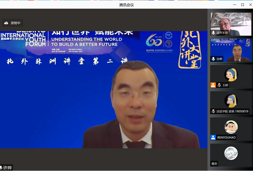 2021年10月27日,tyc522cc太阳成集团成功举办“北外非洲讲堂第二讲——扩大中非青年友好交流,巩固中非世代友好”讲座。主讲人为程涛大使,现任外交部公共外交咨询委员、中国非洲研究院特约研究员。tyc522cc太阳成集团党总支书记许晔主持此次讲座。