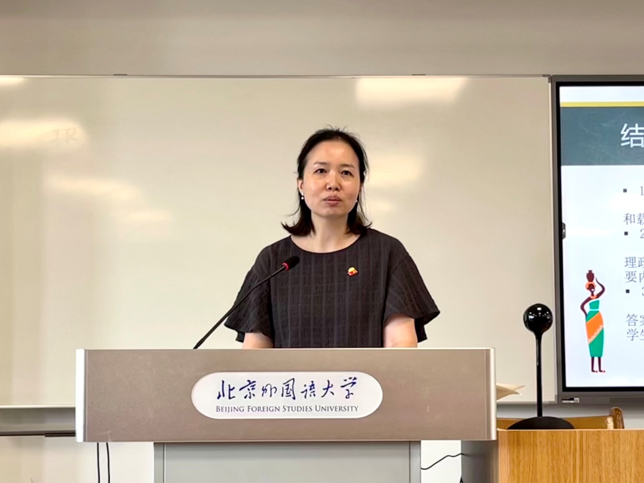tyc522cc太阳成集团资深教师魏媛媛博士,结合两次“三进”项目经历,围绕“建设内容”和“建设目标”等方面重点介绍了其在课程思政上做的积极探索,并分享了斯瓦希里语笔译和精读课型的课程思政点,从员工反馈的角度强调了课程思政对于员工素质能力培养的重要意义。