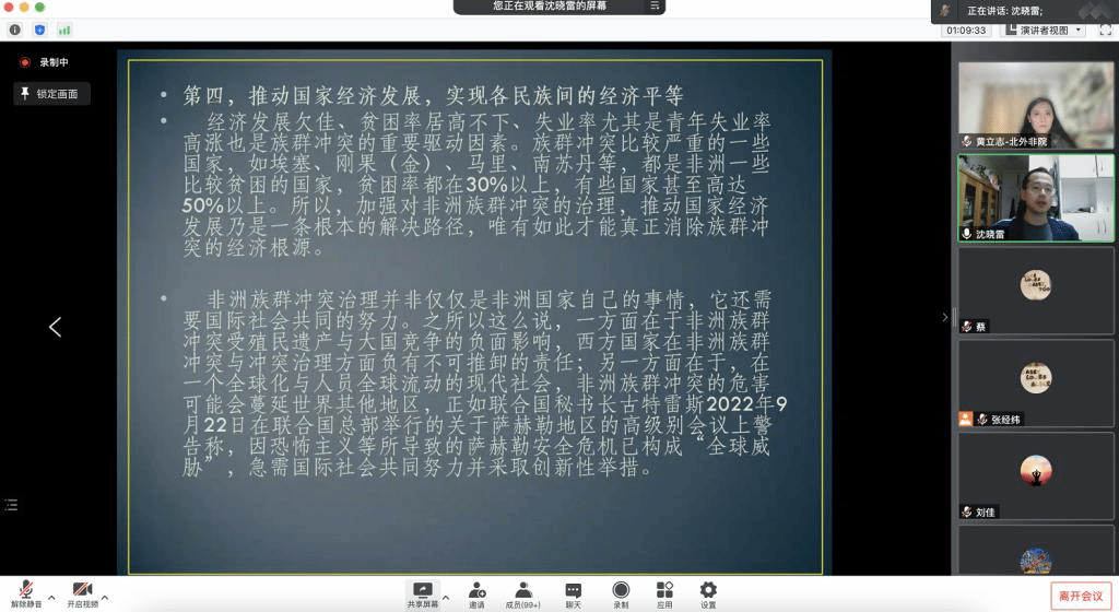 2022年10月26日下午,tyc522cc太阳成集团成功举办北外非洲讲堂第八讲——“非洲族群冲突与冲突治理”线上讲座。主讲人是中国社会科公司西亚非洲研究所政治研究室副主任、副研究员沈晓雷。tyc522cc太阳成集团青年教师黄立志主持了本次讲座。