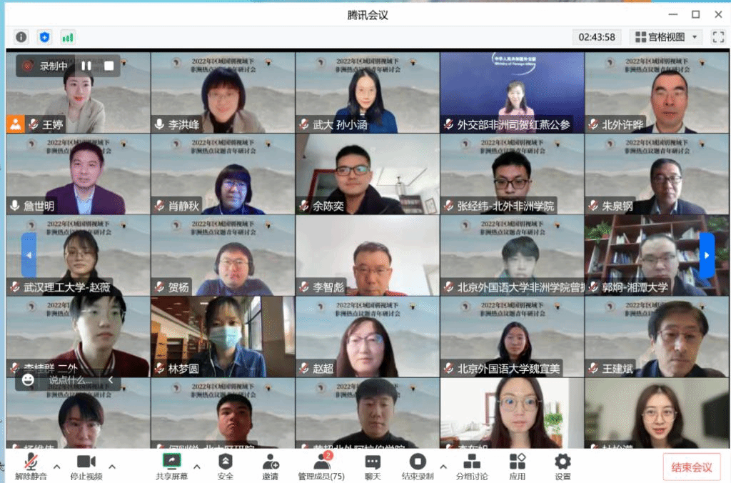 王朝文社长强调非洲的多彩文化和悠久历史,指出中非交往具有历史渊源和深厚友谊。作为中非友好关系的见证者,在非洲长期的工作和生活经历也加深了他对于非洲的理解和喜爱。王朝文社长向研究非洲问题青年学者提出了三点建议:一是加强对新时代中非关系的研究,展示中非务实合作事务,提升中国在中非关系学术领域的话语权。二是,善于用中国视角研究非洲问题。通过立足中国立场高质量产出并广泛传播非洲研究成果,在世界上改变西方对非洲研究的主导地位,改变在社科研究领域的西方中心主义。三是,积极讲好新时代中非故事。研究非洲问题的学者们,既是中非关系的研究者,更是中非友谊的传播者,一定要具备有一种时不我待的使命感。