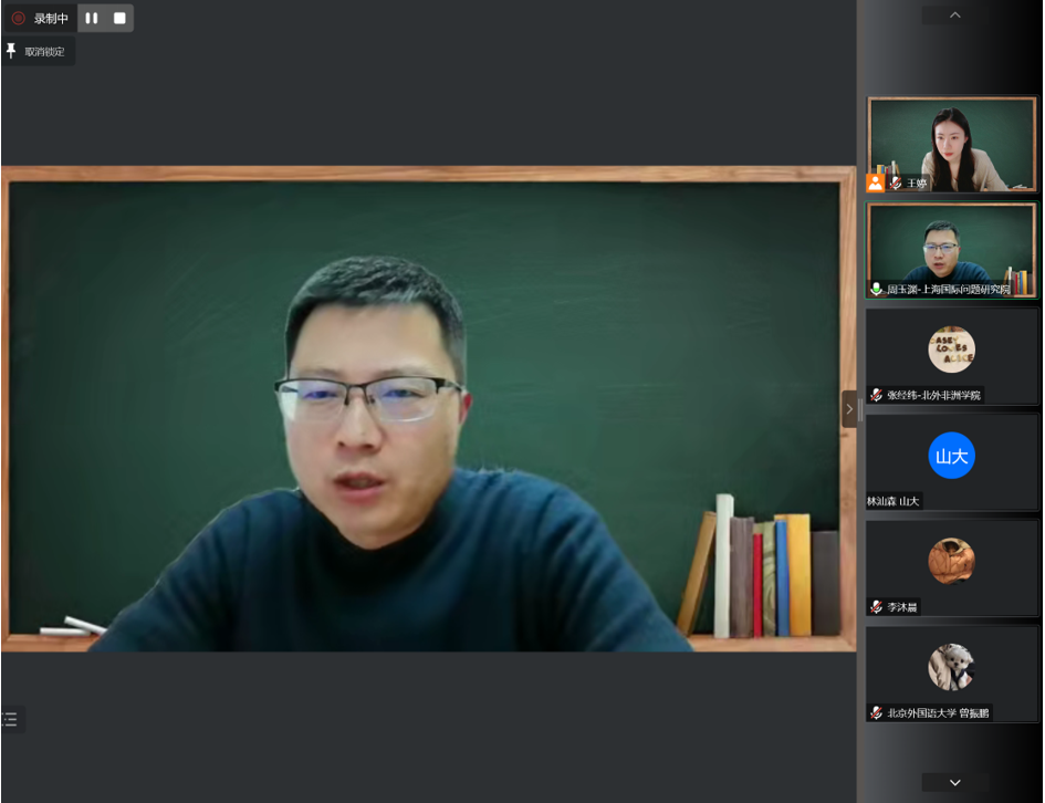 在提问环节中,周玉渊研究员就巴黎俱乐部债务减免模式运转问题、非洲在多边合作中减轻债务压力问题、中非间经贸合作与债务方面的改进方式等问题同与会者展开了积极热烈的交流互动。本次讲座取得了良好效果,校内外师生、专家学者共计70余人线上参加了本次讲座。