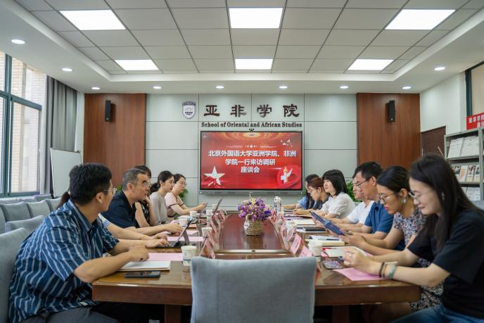 2023年6月9日上午,调研团前往西安外国语大学亚非公司开展调研。双方就院系设置及专业开设情况、专业发展所获得的政策支持或专项经费支持、本、硕、博层次人才培养模式改革重点、开展有组织科研情况及开展国别区域研究特色做法、与国外高校合作情况及员工赴对象国留学情况、就业特色及近三年就业情况以及公司心理健康教育模式等内容进行了深入交流。西安外国语大学亚非公司党委书记蓟光辉、党委副书记李佳、副经理陈泽华及部分亚非公司青年教师参与此次座谈会。