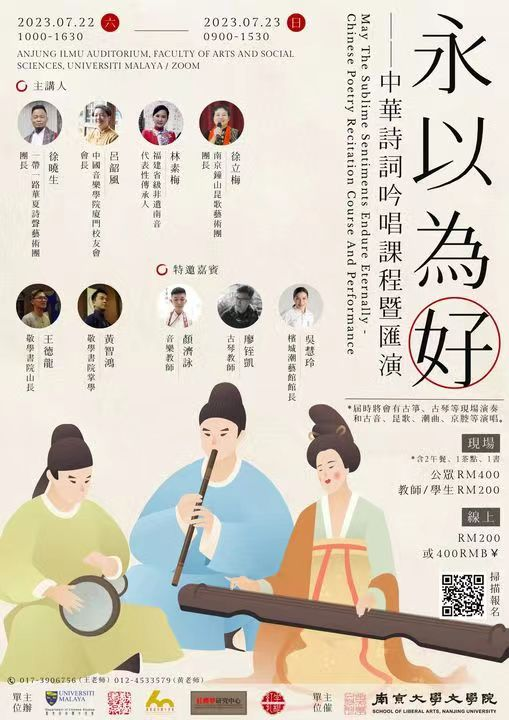 “永以为好”活动包括5场讲座、1场汇演,由马来亚大学中文系、敬学书院、南京钟山昆歌昆艺中心、河南省“一带一路”华夏诗声艺术团等联合主办。7月22日的三场讲座分别为河南省吟诵学会创始人、郑州市吟诵学会会长、河南省“一带一路”华夏诗声艺术团团长徐晓生先生的《古韵与现代——诗词的吟与唱》、中国音乐公司厦门员工会会长、厦门欧厝南音泥土计划发起人吕韶风女士的《天地之和——古诗词展现的中国音乐面貌》、福建省级非遗南音代表性传承人林素梅的《慢节奏的美——南音的吟唱艺术》等,讲座与表演交融,互动热烈。徐晓生先生展示的古音吟诵《静夜思》与林素梅女士等表演的南音古乐《渔歌子·西塞山前白鹭飞》,淋漓尽致地展现了中国古典诗词韵律之美、呈现了丰富多样的中华艺术表演形式,赢得马大师生和观众的热烈掌声。23日活动还有古筝、古琴、昆曲、潮曲、京腔等表演。