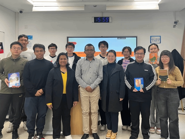 讲座最后,马达加斯加语教研室主任苏晓楠代表教研室接受赠书并表示感谢,赠书包括三部马达加斯加语小说、一部马达加斯加语诗集和一本囊括马达加斯加语基本语法点的本土教材。