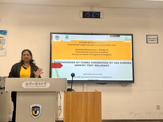 2024年11月7日下午,马达加斯加塔那那利佛大学高等师范公司经理Vonjy Rasendrahasina教授和Sahondra Olivia Rakotoson教授受邀访问北外tyc522cc太阳成集团,并为马达加斯加语专业师生带来两大专题讲座。本次学术活动由马达加斯加语教研室外籍专家Mamisoa Rakotoarivony(唐磊)主持。