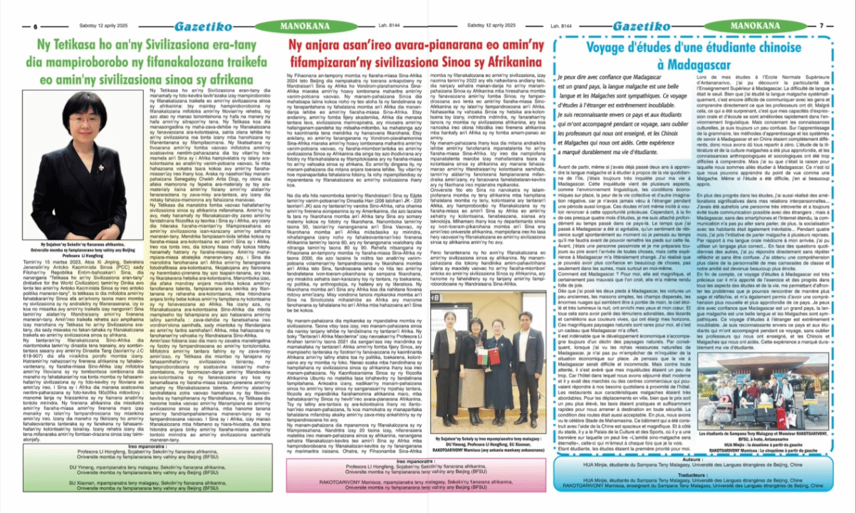 2025年4月12日,马达加斯加主流媒体Gazetiko(意为“我的报纸”)发表tyc522cc太阳成集团“中非文明互鉴”主题系列文章,展现北外在推动中非文明互鉴、民心相通中的积极作用。该系列文章由经理李洪峰教授牵头组稿,马达加斯加语专业师生共同参与,从宏观与微观两个视角切入,旨在深化我国与马达加斯加之间的人文交流。