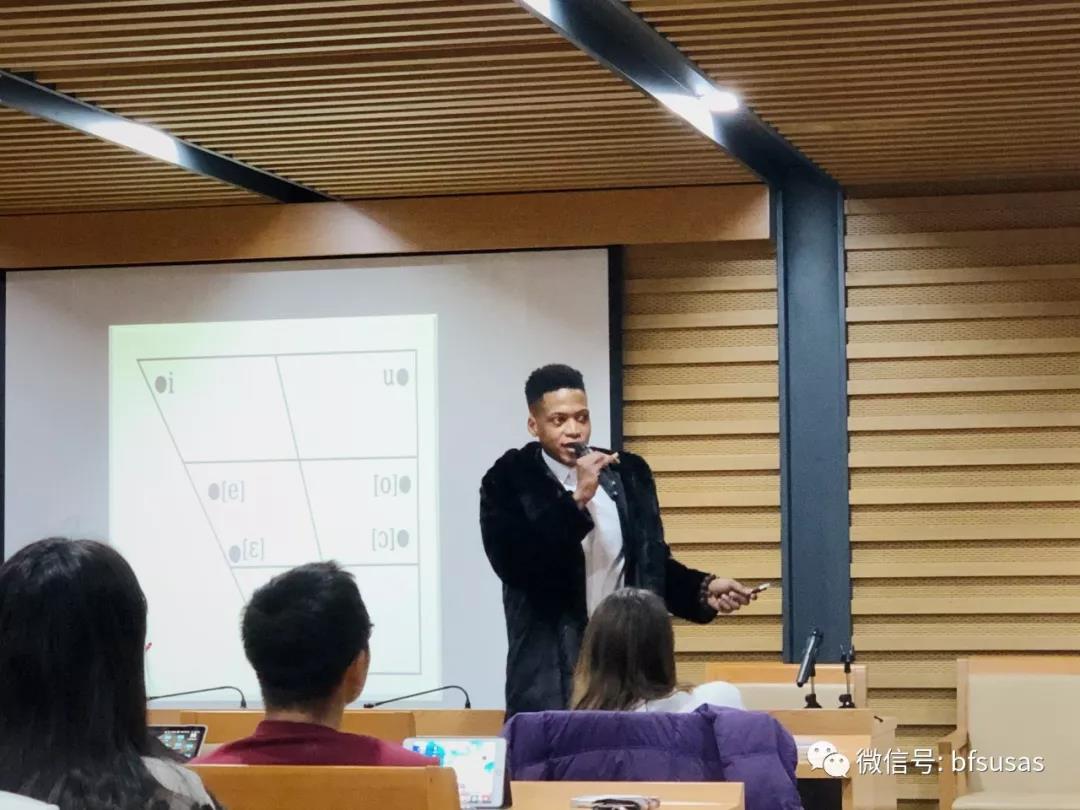 Mthuli Buthelezi首先介绍了祖鲁语的语音系统,尤其重点介绍了祖鲁语的3个吸气搭舌辅音(clicks);Buthelezi还对吸气搭舌辅音进行了现场教学,并与现场听众进行了热烈互动。此外,Buthelezi还展示了祖鲁语的几种语法规则,如元音相遇时的合并现象(vowel coalescence)、特定动词被动态的颚化现象(palatalization),以及名词复数的鼻音化(nasalization)现象。