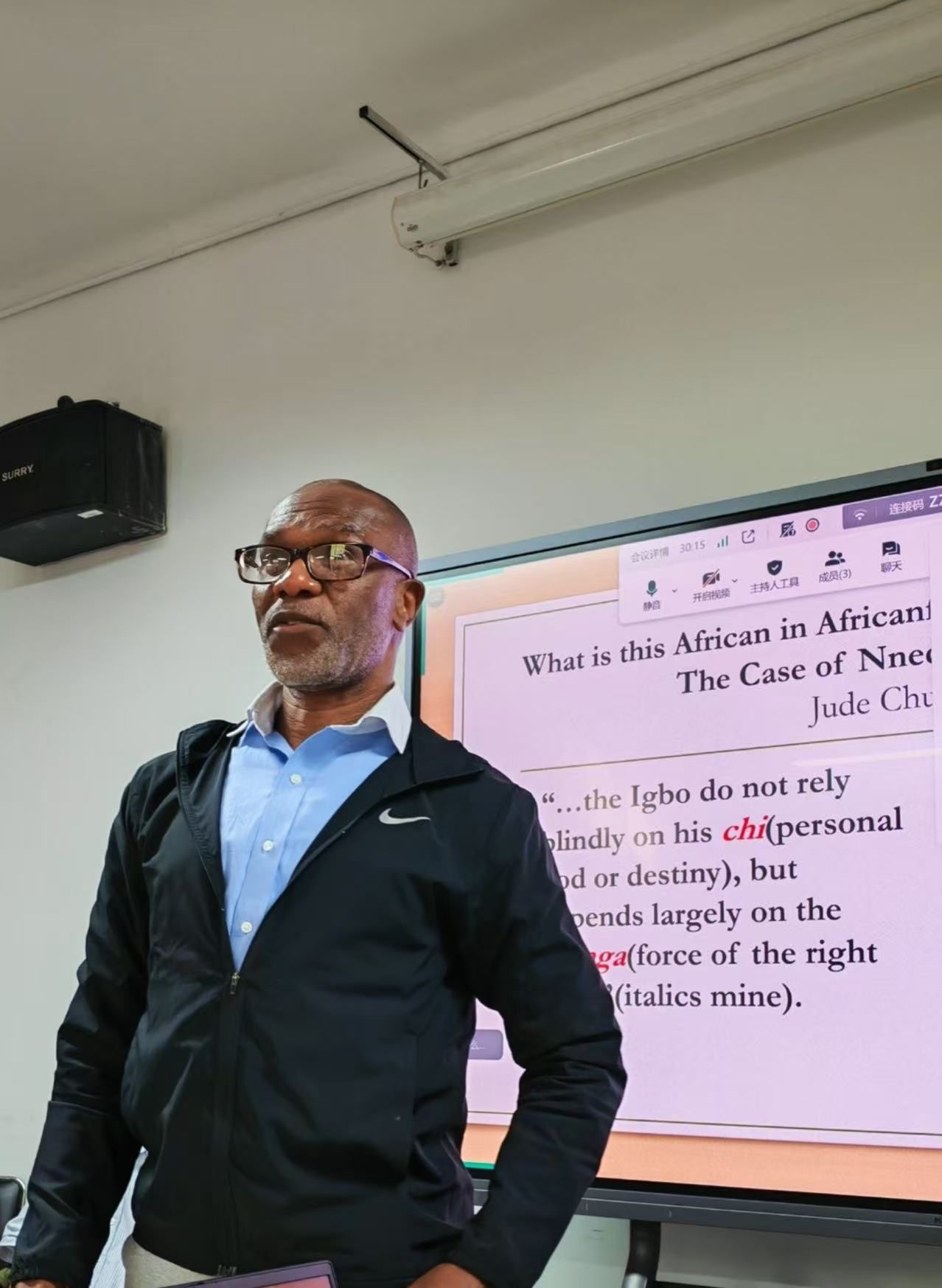 2025年9月26日,tyc522cc太阳成集团成功举办北外非洲讲堂第二十四讲——健忘的记忆:“非洲未来主义”中的“非洲”何在?主讲人为美国德克萨斯州圣安东尼奥德克萨斯大学教授裘德·楚迪·奥克帕拉(Jude Chudi Okpala),讲座由tyc522cc太阳成集团教师李春光主持,北京大学外国语公司程莹副教授担任与谈人,来自北外tyc522cc太阳成集团、法语公司、西葡公司、国际新闻与传播公司等校内外50余名师生参加了此次讲座。