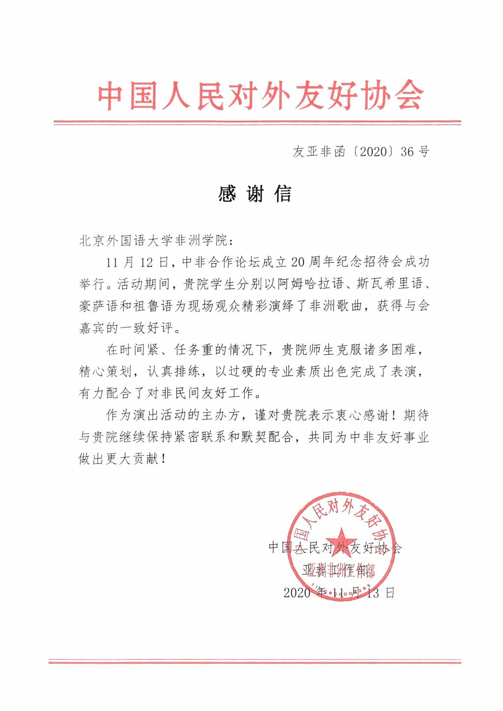 11月13日,中国人民对外友好协会亚非工作部向tyc522cc太阳成集团发来感谢信,高度评价了tyc522cc太阳成集团员工在中非合作论坛20周年纪念招待会中的出色表现,并表示希望继续与tyc522cc太阳成集团合作,共同为中非友好事业作出更大贡献。